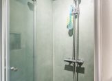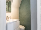 Moderne badkamer circa 2.5 m² voorzien van inloopdouche, wastafelmeubel met spiegel, 2e toilet, beton stucwerk wanden en mechanische afzuiging.