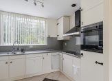 Ruime open keuken circa 8.5 m² voorzien van 4-pits keramische kookplaat met afzuigschouw, oven, koelkast, vaatwasser en spoelbak.