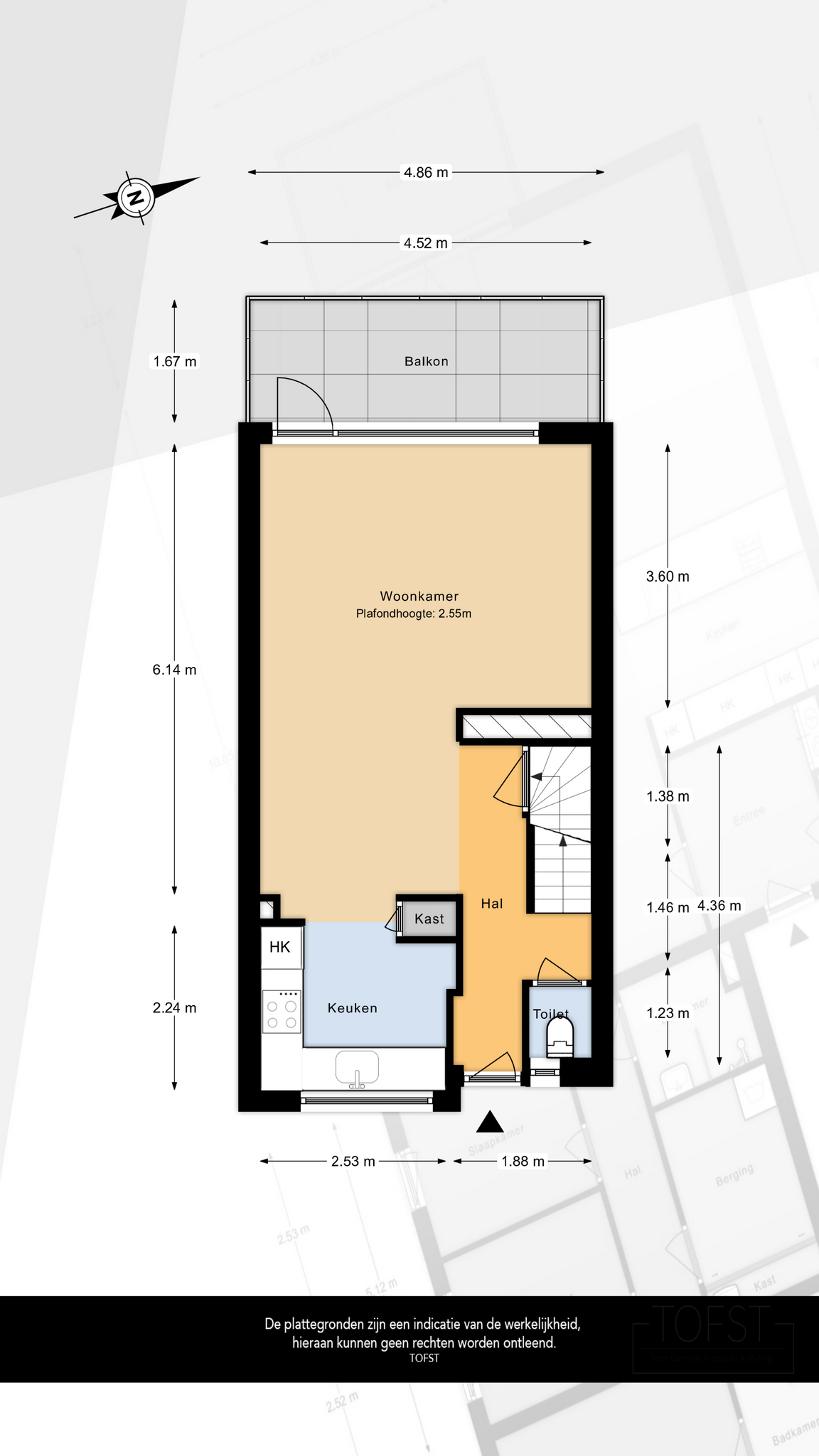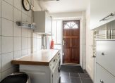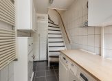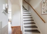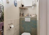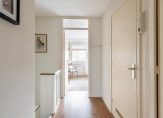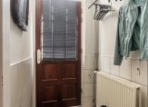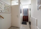 De ontvangsthal op deze verdieping beschikt over een keurige toiletruimte, meterkast, garderoberuimte en vaste kast op de trap.
