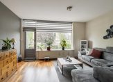 De lichte woonkamer is aan de achterzijde van de woning gelegen en beschikt door de grote hoeveelheid raampartijen over veel natuurlijk lichtinval. De woonkamer is voorzien van een keurige wand- en vloerafwerking, hard houten kozijnen met dubbel glas en middels de loopdeur wordt de toegang verstrekt tot het heerlijke balkon.
