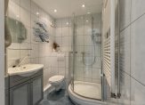 De keurige badkamer is geheel betegeld en voorzien van een douchecabine, tweede toilet en een wastafelmeubel met spiegel en inbouwspots.