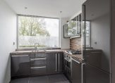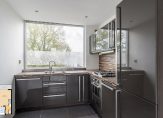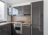 De keuken (circa 7 m²) is uitgevoerd in een nette antracietkleur met een houtlook werkblad. De keuken is voorzien van diverse inbouwapparatuur, waaronder een 4-pits gaskookplaat met afzuigkap, oven, vaatwasser, koel-vriescombinatie, geïntegreerde spoelbak, carrouselkast en voldoende kastruimte.