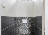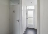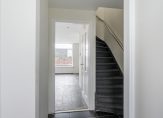 Entree van de woning met een ruime hal, vaste trap naar de slaapverdieping, een keurig toilet met hangend closet (gedeeltelijk betegeld in wit/antraciet), een raampje en een vaste trapkast.