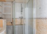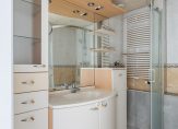 De badkamer (circa 3 m²) is netjes afgewerkt en voorzien van een douchecabine, wastafelmeubel met spiegel en designradiator.