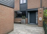 Onderhoudsarme voortuin met oprit voor de auto voorzien van oplaadpunt en plek voor een zitje of de fietsen.