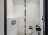 Modern toilet met hangend closet, hand wasbakje, betegeld in antraciet/witte kleurstelling tot het met inbouwspots verlaagde plafond.