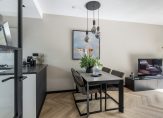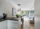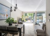 Middels de zwart stalen deur met glas komt u uit in de eetkamer en stapt door naar de tuingerichte woonkamer van circa 26 m² met pvc visgraat vloerafwerking voorzien van hoge plinten, strakke afwerking en een grote aluminium schuifpui naar de achtertuin.