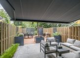 Fraai aangelegde 11.5 meter diepe achtertuin met betegeld terras op het zuiden voorzien van elektrische zonwering, composiet vlonder terras, tuinberging, houten erfafscheidingen en een heerlijke steiger aan de singel met groen omgeven voor veel privacy.