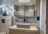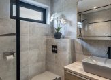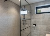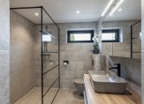 Moderne badkamer uit 2023 is voorzien van een ruime inloopdouche met zwart stalen/glazen douchewand en easy drain regengoot, wastafelmeubel met waskom en spiegelkast met verlichting, tweede hangend toilet, betegeld met fraaie betegeling tot het met inbouwspots verlaagde plafond, voorzien van raam en mechanische afzuiging.