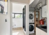 Was- stookruimte met opstelling wasmachine, wasdroger, cv-combiketel, mv-box en wastafelmeubel.