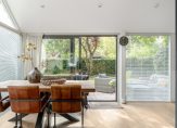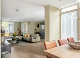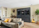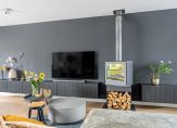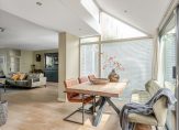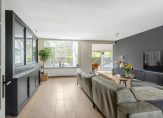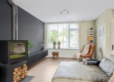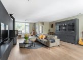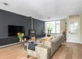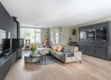 De royale woonkamer is vergroot door het verplaatsen van de keuken naar de aanbouw en is samen met de eetkamer maar liefst circa 45 m² groot. Sfeervol afgewerkt met eikenhouten vloerdelen met hoge plinten, vloerverwarming, strak stucwerk en een gezellige houtkachel.