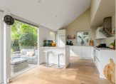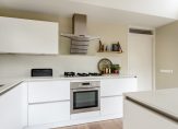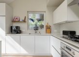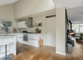 De moderne en royale greeploze witte woonkeuken van circa 14 m² is voorzien van een composiet blad en een werkeiland met zitbar. Hier vindt u alle hedendaagse inbouwapparatuur, waaronder een 5-pits gaskookplaat met wokbrander en afzuigschouw, oven, vaatwasser, koel-/vriescombinatie en geïntegreerde spoelbak met boiler. Het zijraam zorgt voor extra lichtinval. Aansluitend bevindt zich de vide voor een speels effect en een schuifpui naar de achtertuin.