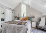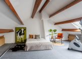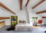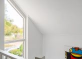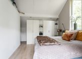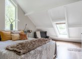 Via de trap bereikt u de eerste verdieping met slaapkamer 2 onder het dak van de aanbouw, circa 12 m², voorzien van een zichtbare dakconstructie, zijraam, dakraam en bergruimte.