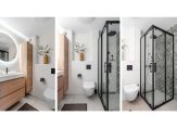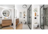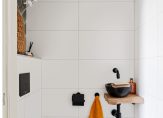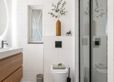 Modern toilet met hangend closet, waskom met meubel, afgewerkt in grijs/witte kleurstelling tot het plafond en voorzien van mechanische afzuiging.