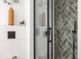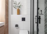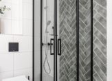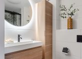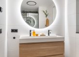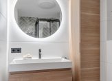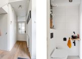 De moderne eerste badkamer (2023) is uitgerust met een inloopdouchecabine met stortdouche, easy drain regengoot, wastafelmeubel met spiegel en verlichting, een hoge kast, derde hangend toilet en is fraai betegeld tot het stucplafond met mechanische afzuiging.