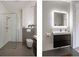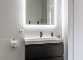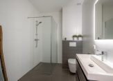 Moderne badkamer circa 5 m² voorzien van een inloopdouche met easydrain met easy drain regengoot, wastafelmeubel met spiegel voorzien van verlichting, tweede hangend toilet, design radiator, moderne betegeling tot het plafond en mechanische afzuiging,