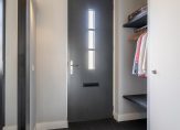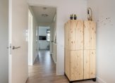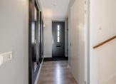 Entree woning onder de luifel, ruime ontvangsthal voorzien van meterkast, garderoberuimte, trap naar de eerste verdieping en voorzien van moderne hout look laminaatvloer met hoge plinten.