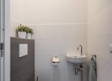 Modern design toilet met hangend closet, handwas bakje, antraciet/witte betegeling en mechanische afzuiging.