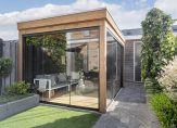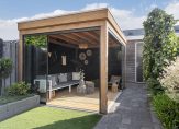 Vrijstaande overkapping totaal circa 11 m² met glazen schuifwanden, verlichting en elektra.
