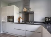 Moderne hoogglans witte open keuken met granieten blad, totaal circa 10 m², voorzien van alle hedendaagse keukenapparatuur als 5 pits gaskookplaat met afzuigschouw, combi-magnetron, koel-vriescombinatie, vaatwasser en voldoende bergruimte.