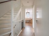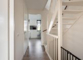 Overloop, gehele verdieping is voorzien van moderne houtlook laminaatvloer met hoge plinten, strakke wand afwerking en een trap naar de tweede verdieping.