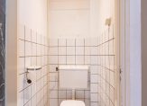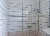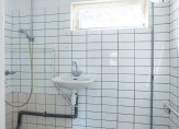 Aan de voorzijde van de woning gelegen een eenvoudige badkamer met douchehoek, wastafel, een raampje voor natuurlijke ventilatie en gedeeltelijk betegeld.