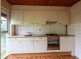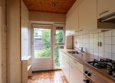 Half open keuken van circa 7 m² is voorzien van keukenblok met lichte fronten, kunststof werkblad, 4-pits gaskookplaat met afzuigkap, oven, vaatwasser, kast voorzien van opstelling cv-combiketel en deur naar de achtertuin.