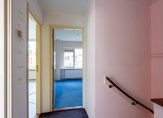 Hal voorzien van trap naar de eerste verdieping, trapkast met opstelling wasmachine en een keurig toilet welke gedeeltelijk is betegeld.