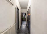 Entree woning, hal voorzien van trapkast met meterkast en bergruimte, toilet en badkamer. Aan het einde van deze hal is er toegang tot de woonkamer.