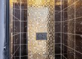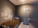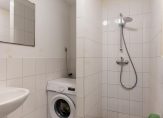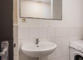 De badkamer bevindt zich in het midden van de woning, is eenvoudig van opzet en beschikt over een douche, wastafel en de aansluiting voor de wasmachine .