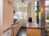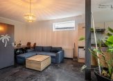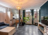 De tuingerichte woonkamer met laminaatvloer heeft een fijne lichtinval door het raam in de zijgevel en de openslaande deuren naar de diepe achtertuin. Via de woonkamer is er toegang tot de slaapkamer/werkkamer (deze kamer heeft geen daglicht). De half open keuken heeft een eenvoudig keukenblok en is toe aan vervanging.