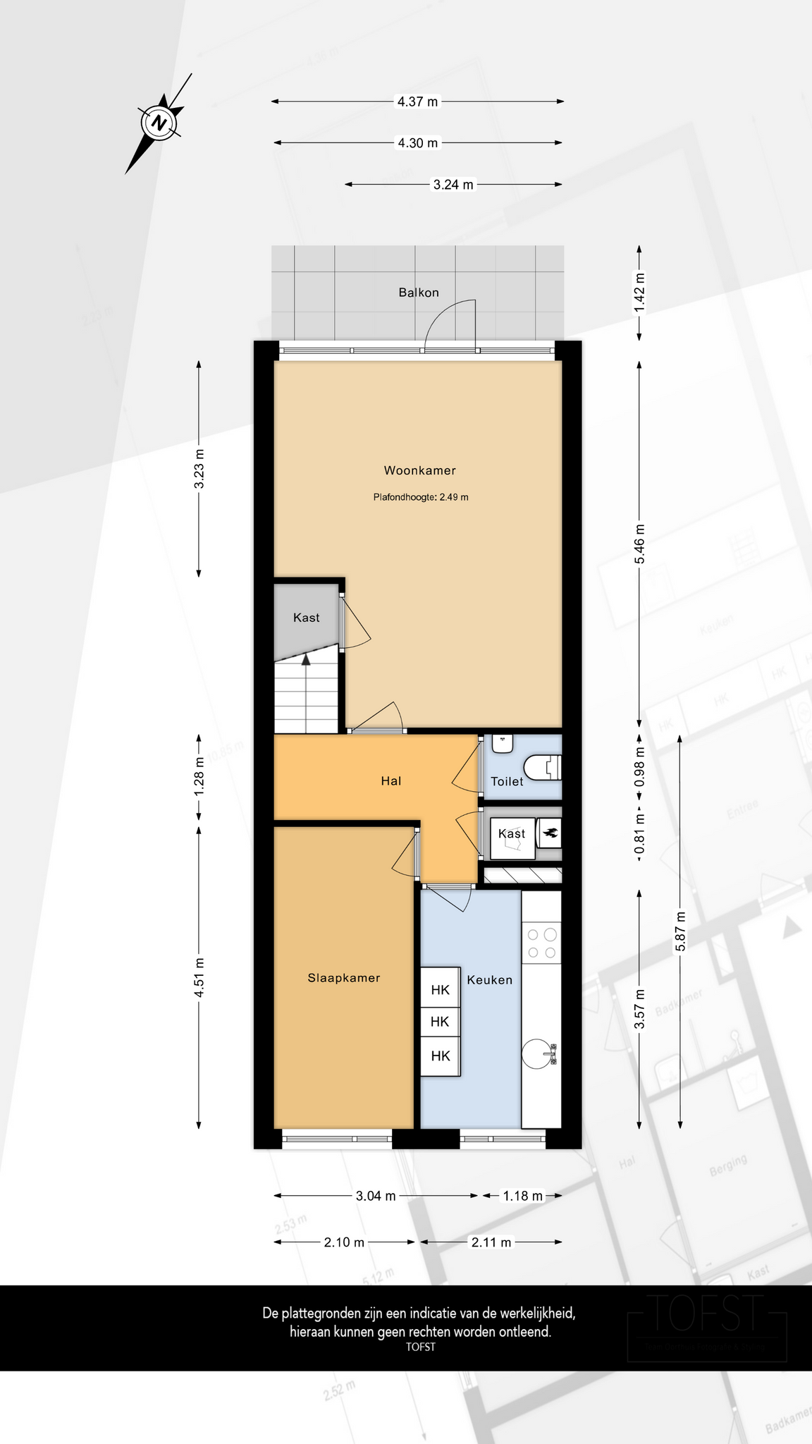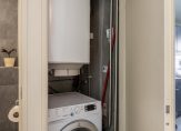 Middels de trap komt u uit in de tussen hal op de lager gelegen woonetage, hier vindt u de woonkamer, de keuken, het toilet en de 2e slaapkamer. De vaste kast met opstelling elektrische boiler, opstelling wasmachine en mechanische afzuiging.
