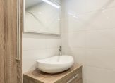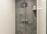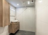 De moderne badkamer is betegeld tot het plafond in hedendaagse grijs- en wit tinten, voorzien van inloopdouche met stortdouche, wastafelmeubel met waskom en spiegel voorzien van verlichting, hoge kast, design radiator en mechanische afzuiging.