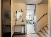 Overdekte entree met naast de voordeur de meterkast. De ontvangsthal biedt toegang tot de trap naar de eerste verdieping, de eerste slaapkamer en de badkamer.
