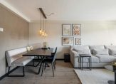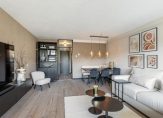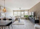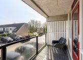 Ruime woonkamer met een houten vloer en grotendeels gestucte wandafwerking. Vanuit de woonkamer is het ruime overdekte balkon te bereiken. Het balkon is gelegen op het oosten met mooie vlonderdelen. Je kunt hier lekker van het ochtendzonnetje genieten.