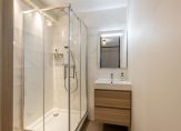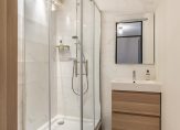 De moderne badkamer is grotendeels betegeld in hedendaagse grijs- en wit tinten, voorzien van douchehoek, wastafelmeubel met spiegel, bergkast en design radiator.