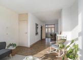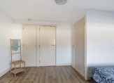 Doorzon woonkamer met eetkamer totaal circa 35 m² voorzien van houtlook laminaatvloer met hoge plinten, strakke afwerking en vaste kast. Hier is het eenvoudig een 2e slaapkamer te realiseren.
