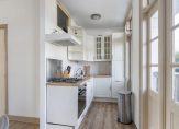 Open keuken met 4 m² in lichte kleurstelling met houtlook blad en alle hedendaagse keukenapparatuur als een 4-pits gaskookplaat met afzuigkap, oven, vaatwasser en spoelbak.