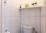 Overloop voorzien van keurig toilet met antraciet/witte betegeling.