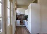 Open keuken met 3 m² in witte kleurstelling met houten blad en alle hedendaagse keukenapparatuur als een 4-pits gaskookplaat met afzuigkap, oven, koel-vriescombinatie en spoelbak.