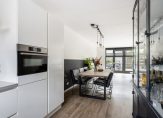 De moderne keukenopstelling aan de voorzijde van de woning beschikt over alle hedendaagse inbouwapparatuur, waaronder een 4-pits gaskookplaat met afzuigschouw, combi oven, vaatwasser, heetwaterkraan, koelkast en vriezer.