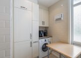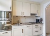 De keuken is vergroot waardoor er een fijne ruimte is ontstaan met aan beide zijden een keukenopstelling in vanille kleur en alle hedendaagse inbouwapparatuur waaronder een keramische kookplaat, afzuigkap, vaatwasser, magnetron, oven en koel-/vriescombinatie. Ook heeft de keuken een handige apothekerskast en de aansluiting voor de wasmachine. Vanuit de keuken is er toegang tot het balkon gelegen aan de achterzijde met zich op de gezamenlijke binnentuin.