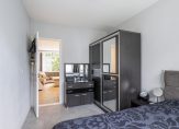 De woonkamer heeft een tegellook laminaatvloer met hoge plintafwerking en een fraai plafond met inbouwspots. Via de woonkamer is er toegang tot de ouderslaapkamer met dezelfde laminaatvloer.