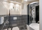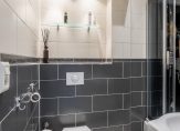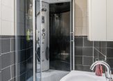 De badkamer is ruim van opzet, is volledig betegeld en beschikt over een douchecabine, wastafelmeubel en een toilet.