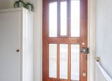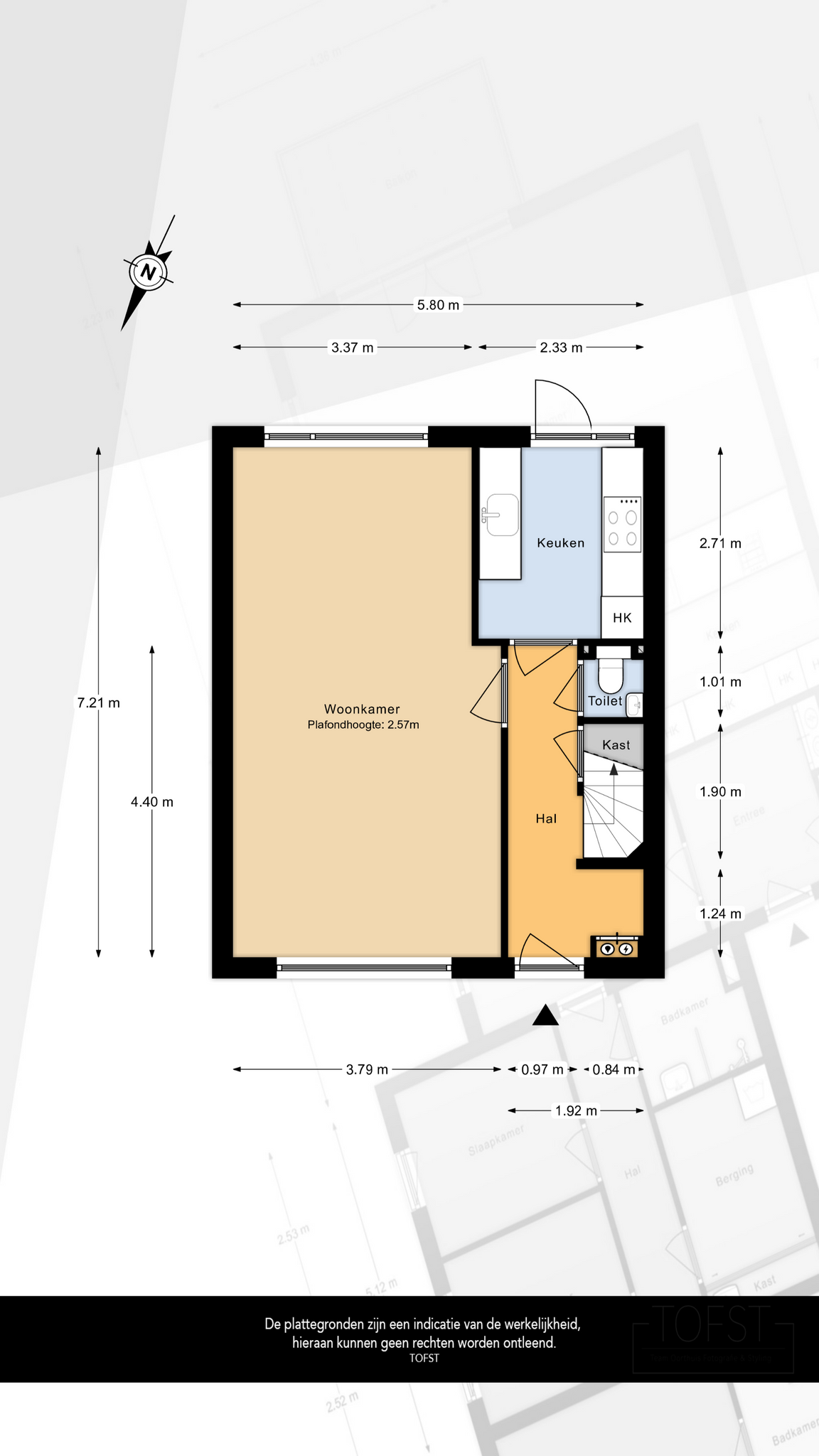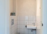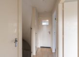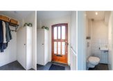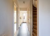 Bij binnenkomst betreed je een fraaie entree met luifel, die leidt naar de hal. Hier vind je de garderoberuimte, meterkast, een vaste trap naar de eerste verdieping en een praktische trapkast voor extra opbergruimte. Het moderne toilet, voorzien van een hangend closet en handwasbakje, is deels betegeld en uitgerust met luchtafvoer.