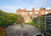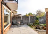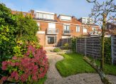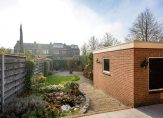 Aan de achterzijde van de woning ligt een royale, zonnige tuin van circa 18 meter diep, in totaal 107 m². Deze tuin heeft een ruim terras, groene borders, een grasveld, een stenen berging van 8 m² met elektra en een achterom.