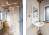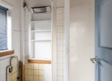 Badkamer aan de zijgevel, circa 4 m² voorzien van douchecabine, wastafel met spiegel, wasmachine aansluiting en zijramen.