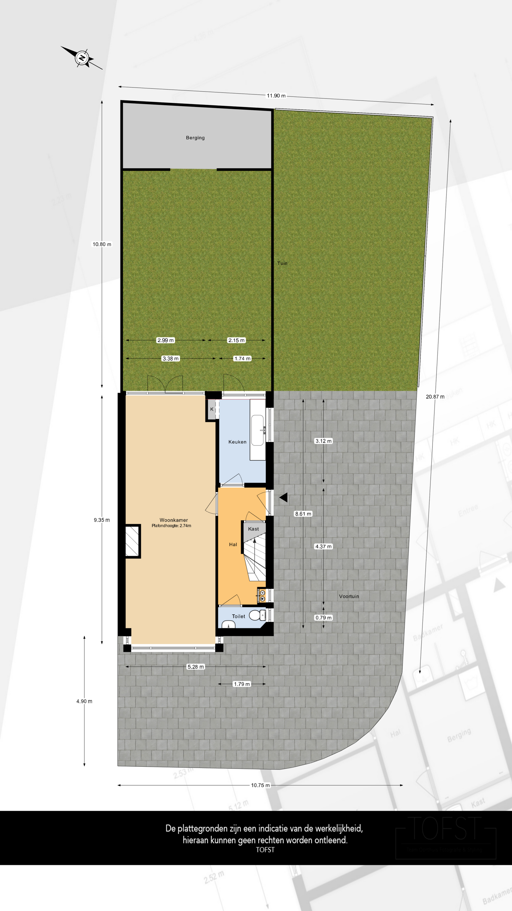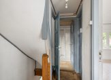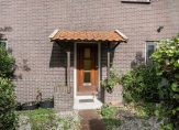 Entree woning aan de zijgevel met luifel, gang/hal voorzien van garderoberuimte, trapkast met meterkast en toilet.