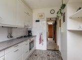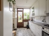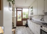 Dichte keuken circa 8 m² voorzien van 4-pits gaskookplaat met afzuigkap, spoelbak en deur naar de achtertuin.