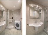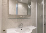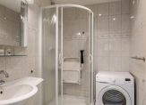 Eenvoudige doch nette badkamer circa 3,5 m² voorzien van douchecabine, wastafel en wasmachine aansluiting.